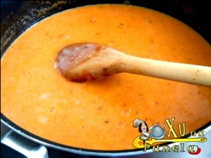 Junte o leite de coco e o caldo de galinha e deixe cozinhar por mais 5 minutos – corrija o sal e ponha pimenta do reino. (Atualização: junte o camarão nessa etapa)